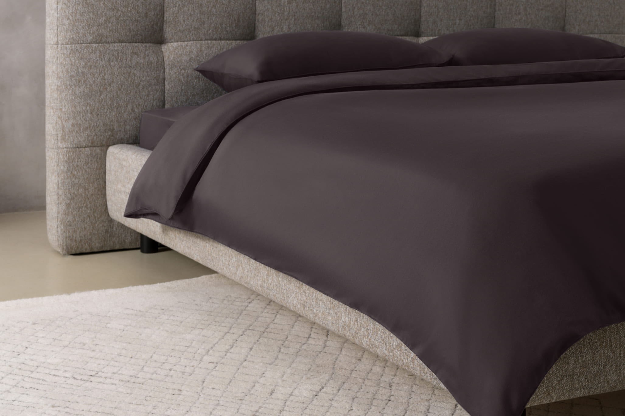 В коллекции доступен монохромный комплект, как ровный, только что разглаженный приливом берег. А есть — с широким белым кантом по краю пододеяльника и наволочек: он задаёт лёгкий ритм, как следы, которые ветер рисует на воде.