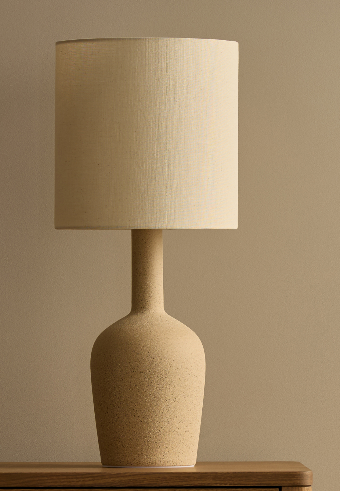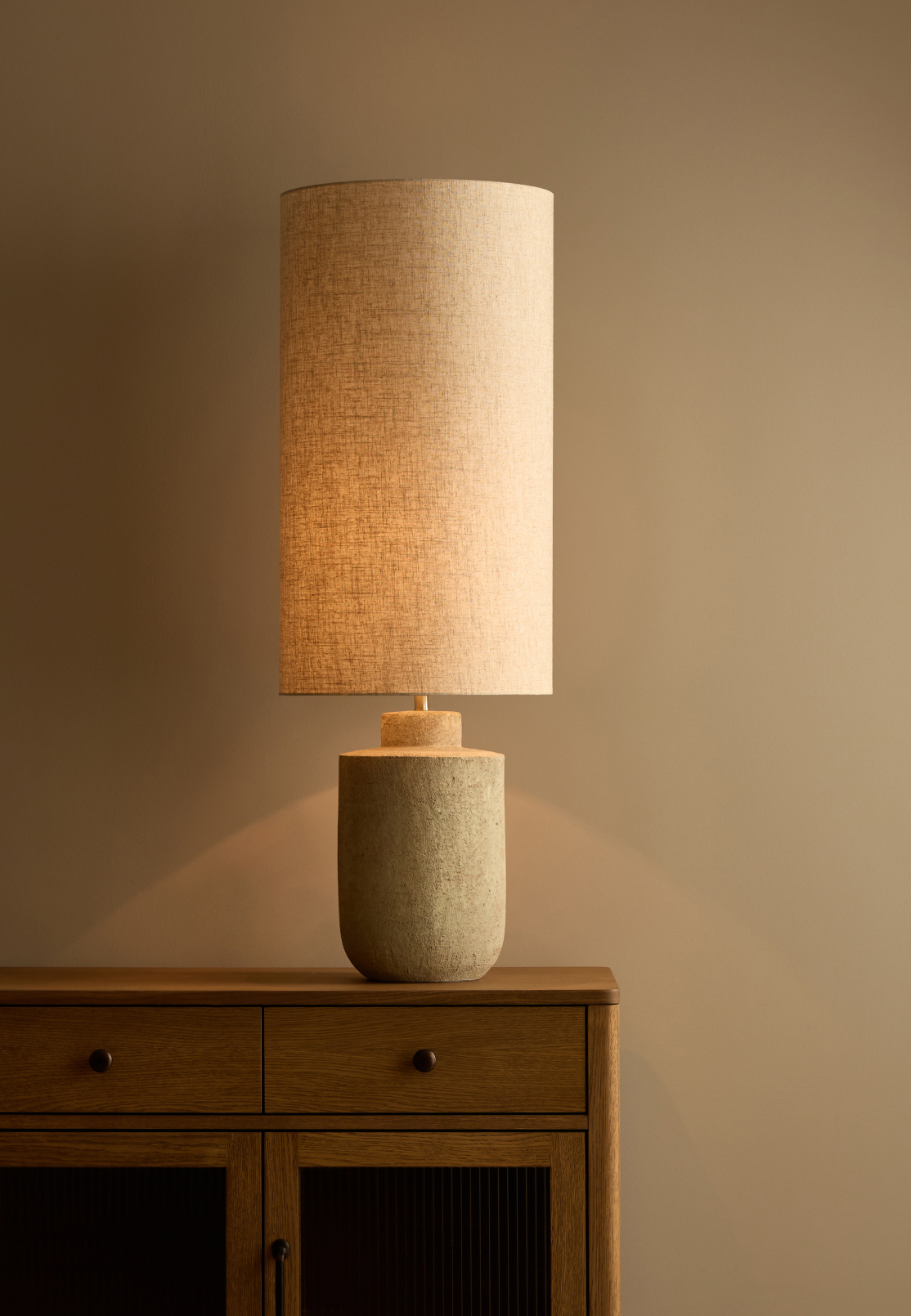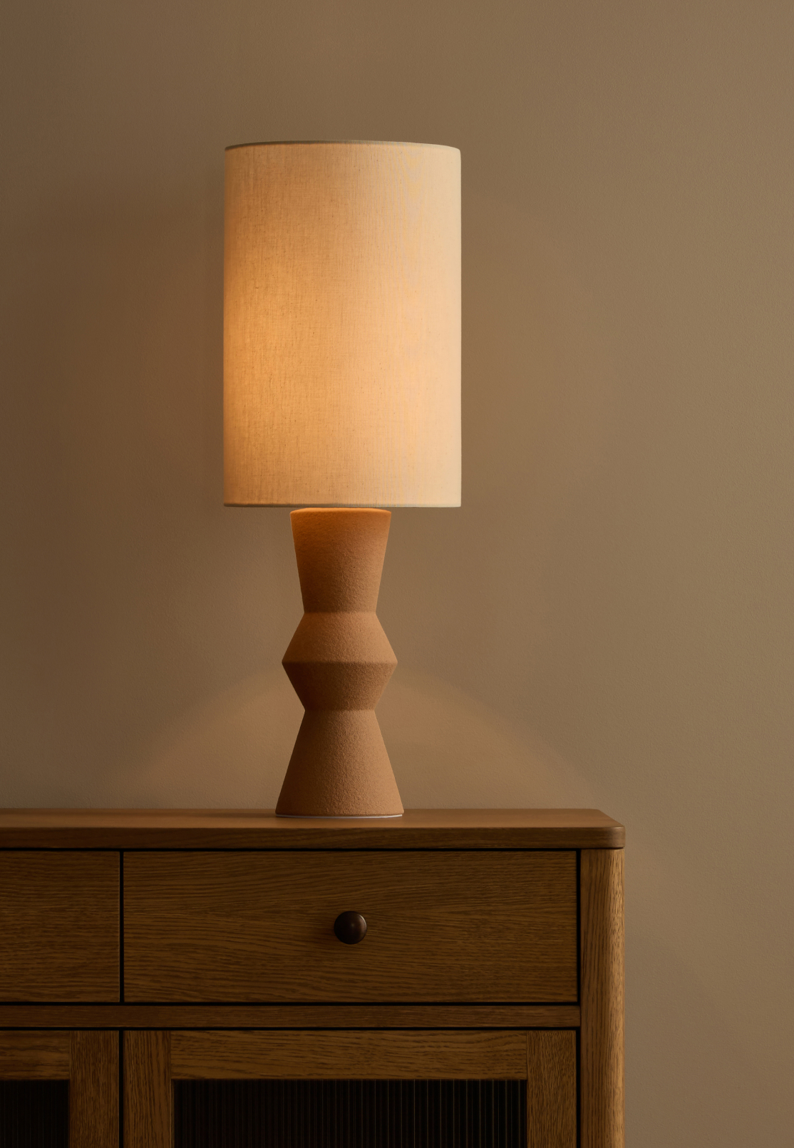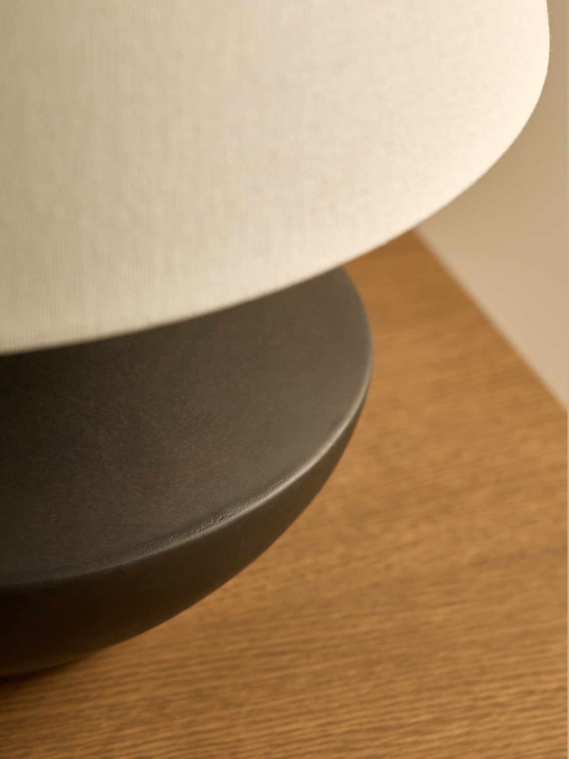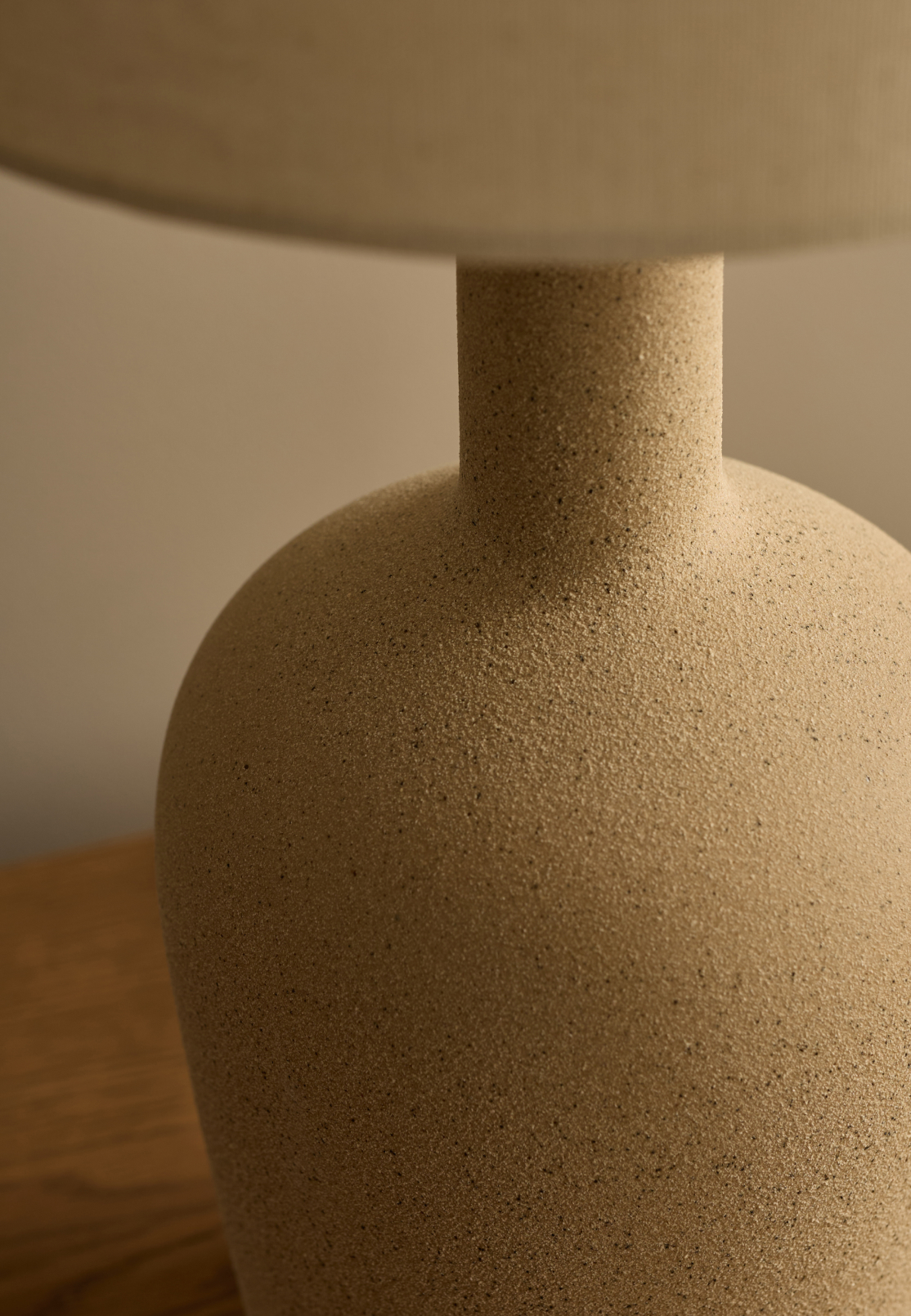 Например, настольная лампа Sena Beige — воплощение естественности. Её округлое основание, с зернистой, словно выветренной поверхностью керамики, похоже на тёплую горную породу. Этот мотив подхватывает тканевый абажур схожей, чуть более мягкой зернистости. Разные по своей сути материалы, объединённые цветом и созвучием текстур, рождают сложную гармонию, где граница между твёрдым и мягким, земным и рукотворным — размывается.