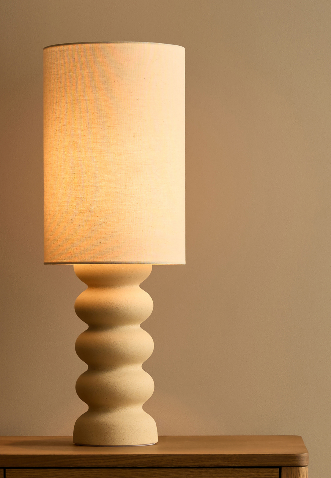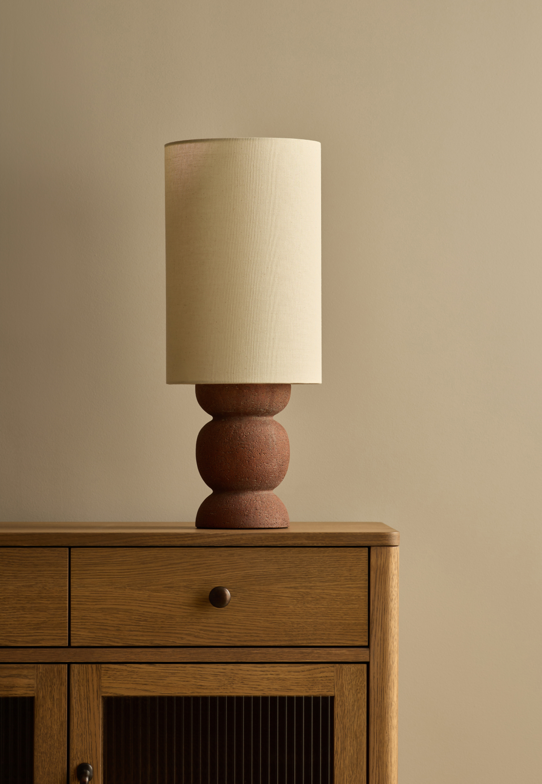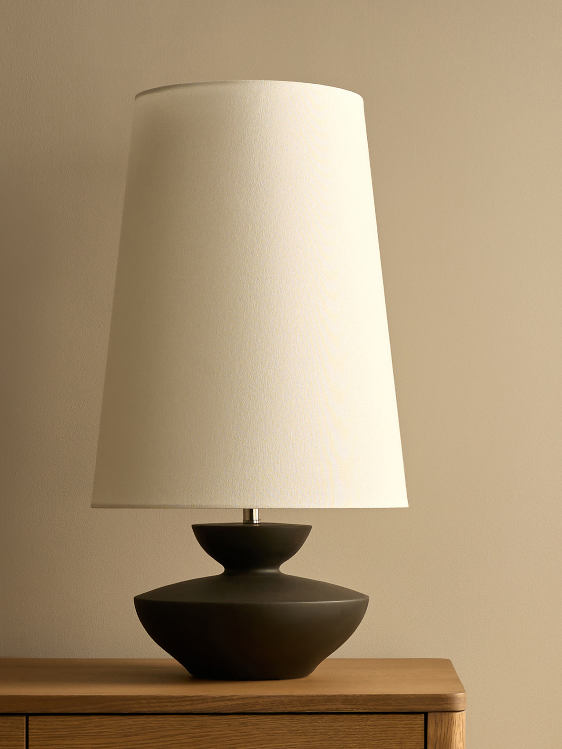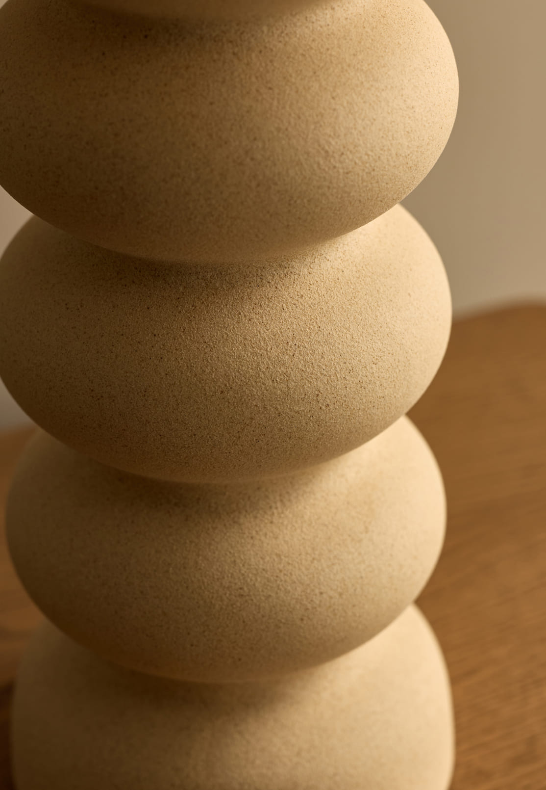 Например, настольная лампа Sena Beige — воплощение естественности. Её округлое основание, с зернистой, словно выветренной поверхностью керамики, похоже на тёплую горную породу. Этот мотив подхватывает тканевый абажур схожей, чуть более мягкой зернистости. Разные по своей сути материалы, объединённые цветом и созвучием текстур, рождают сложную гармонию, где граница между твёрдым и мягким, земным и рукотворным — размывается.