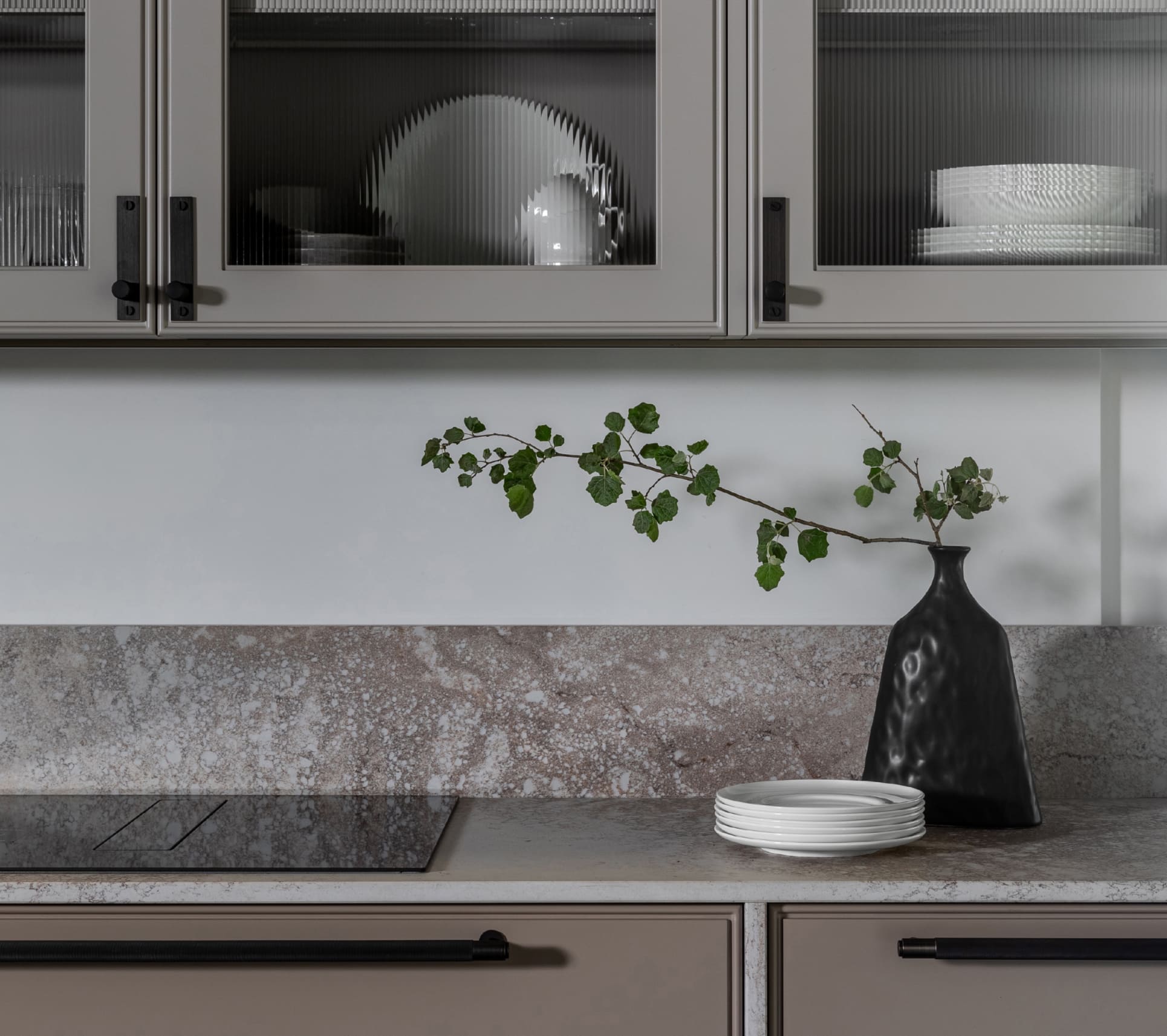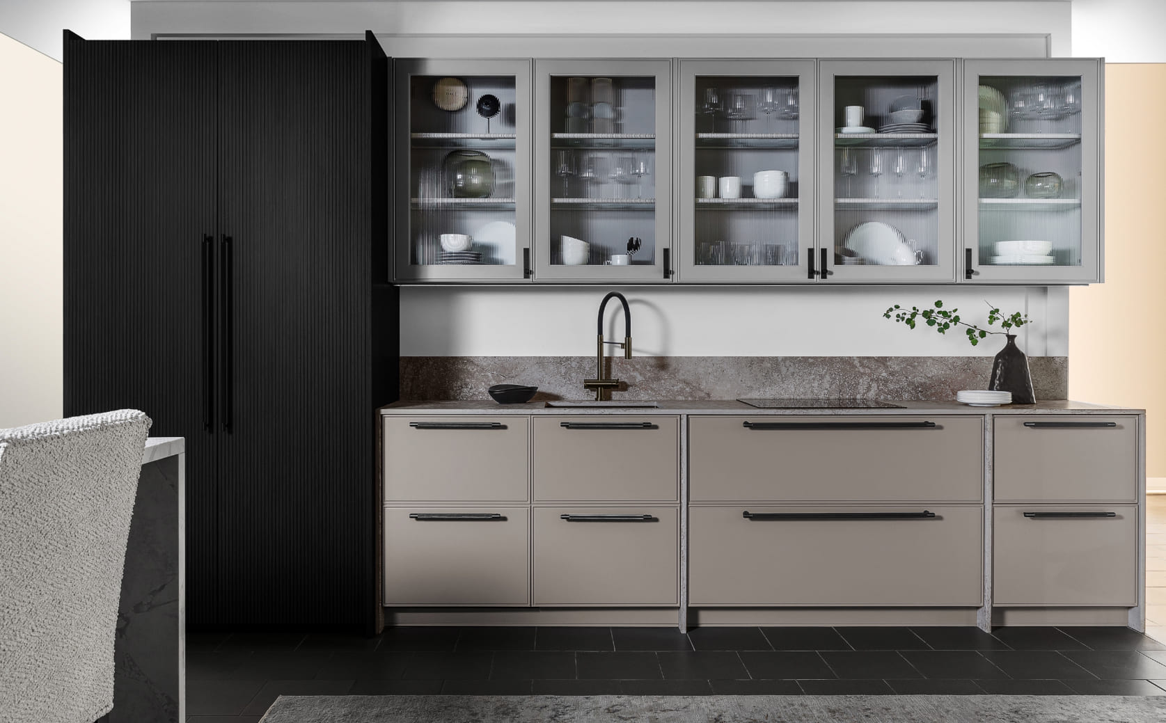 Минималистичную композицию оживляет прозрачное рифлёное стекло в верхнем ярусе кухни, который оснащён встроенной подсветкой: такая витрина отлично подойдёт для хранения эстетичных сервизов и элементов сервировки.