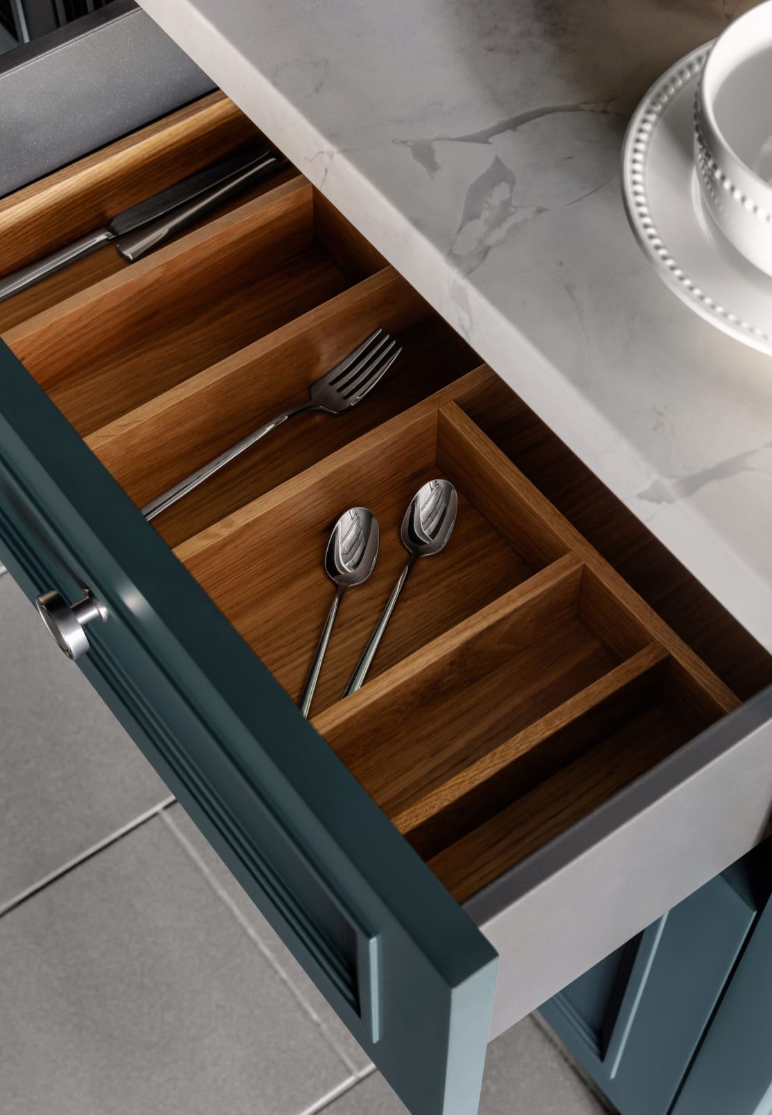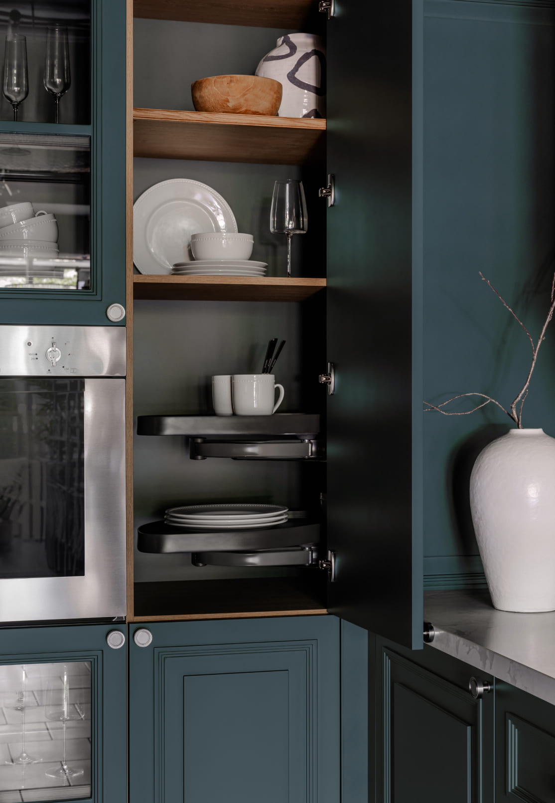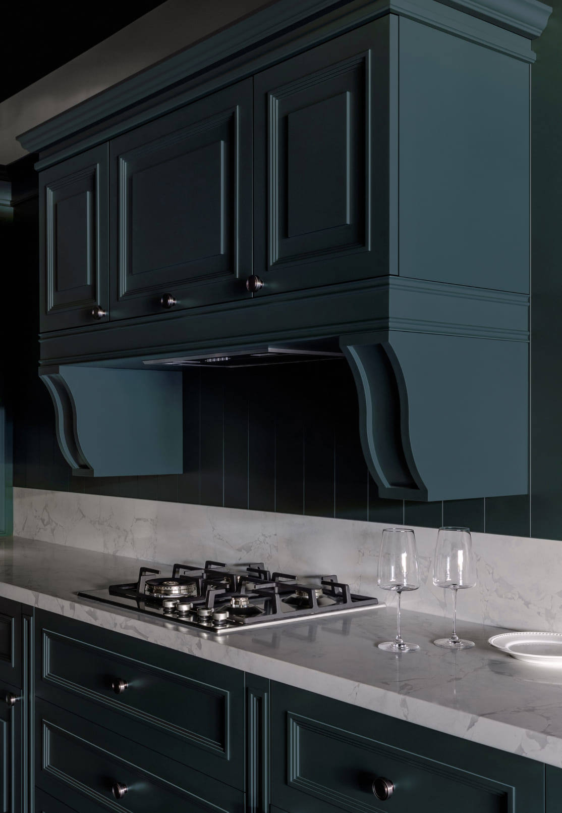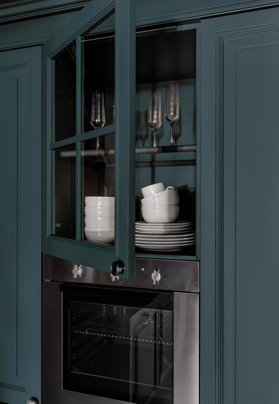 Фасады украшены рельефными декоративными филёнками, подчёркивающими строгую геометрию шкафов, а рабочую зону обрамляет портал с элегантно изогнутыми капителями.