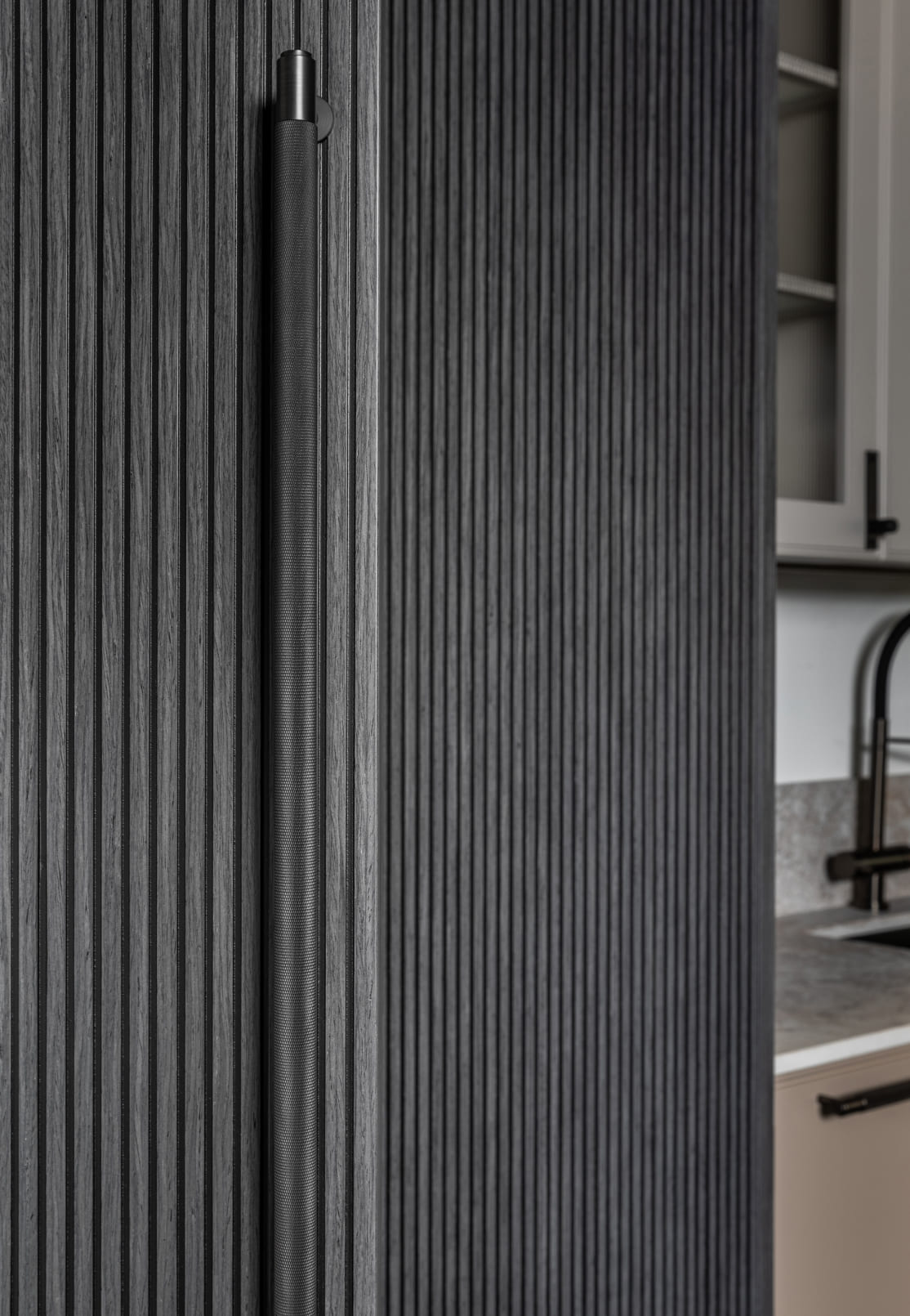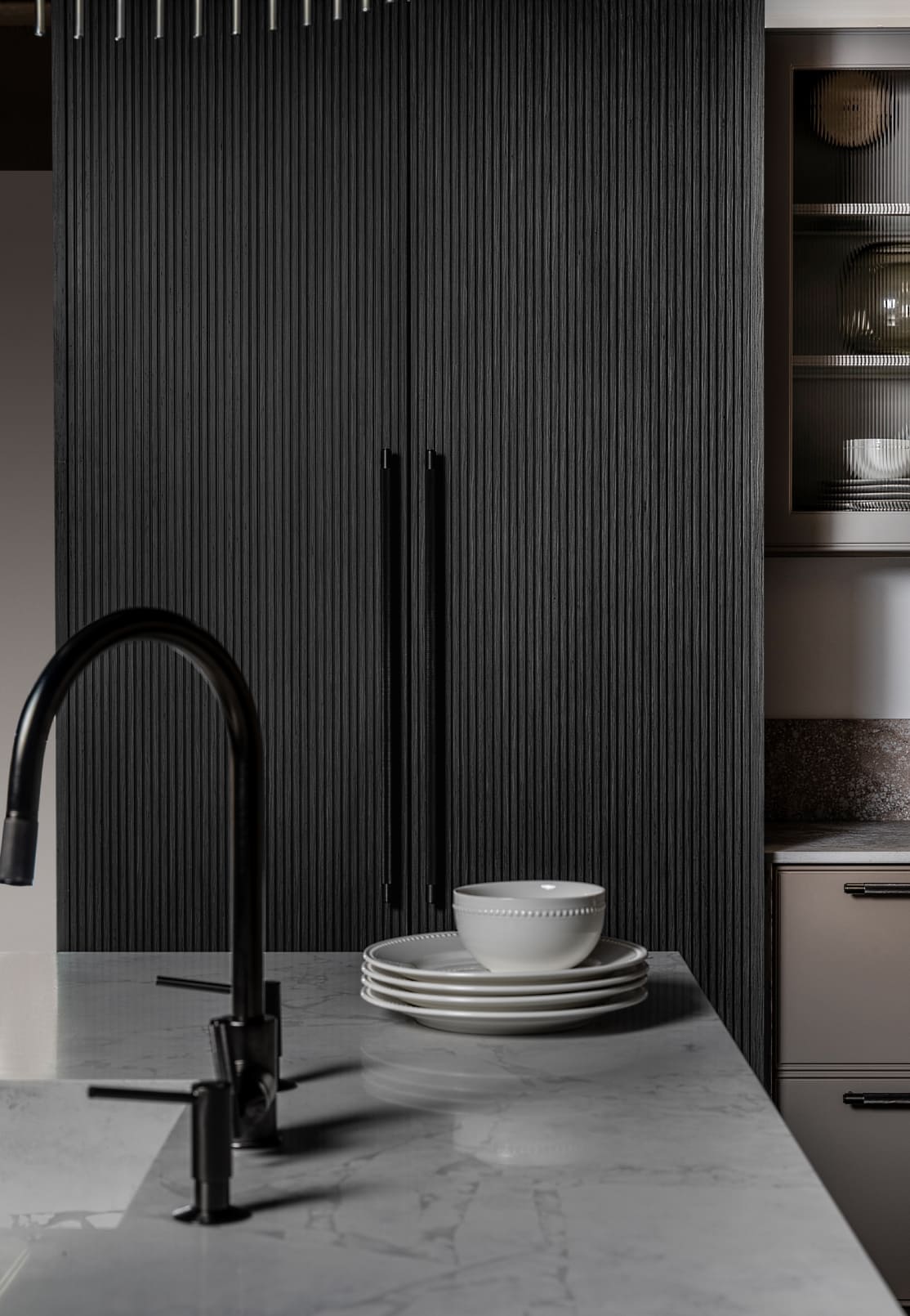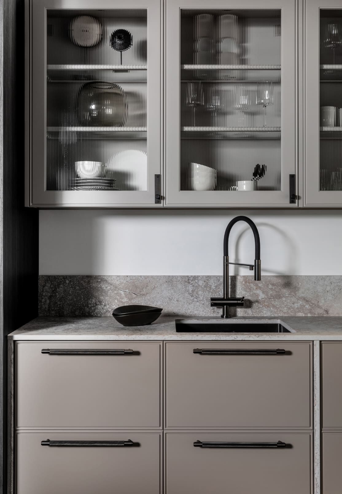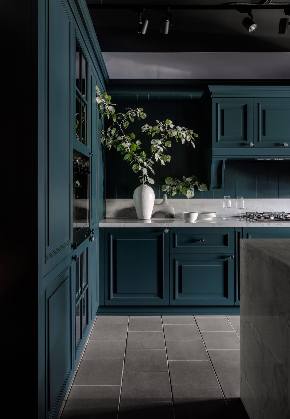 Фасады выполнены из МДФ и покрыты матовой эмалью в благородном оттенке «серый мох», который специально для Dantone Home разработала колорист Дарья Гейлер.