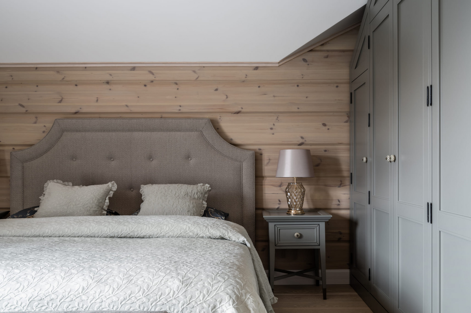 Для хозяйской спальни на втором этаже была выбрана кровать Мэнсфилд с фигурным изголовьем. Её классический шарм, декоративные строчки и стяжки визуально смягчили ломаные линии мансарды. Банкетка Норвич в изножье служит не столько украшением, сколько очень удобным дополнением к кровати, куда перед сном можно положить покрывало, декоративные подушки и одежду. Встроенный шкаф и комод отлично справляются с хранением вещей.