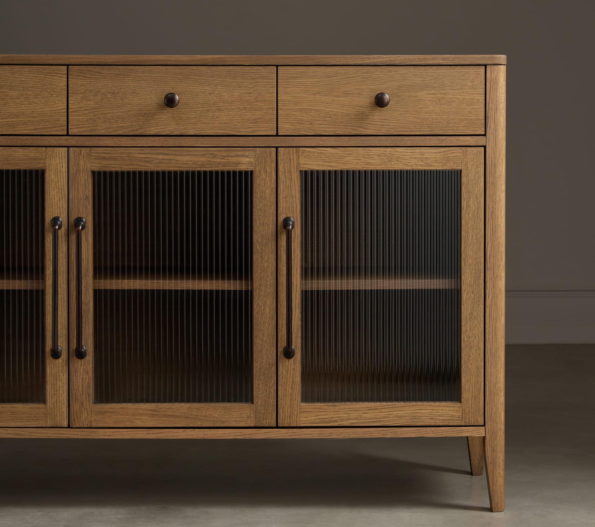 В основе — полилог материалов: массив дуба, шпонированного МДФ в оттенке грецкого ореха и рифлёного стекла. Коллекция включает низкие и высокие витрины, комоды и прикроватные тумбы, предлагая решения для разных зон интерьера с единым гармоничным почерком.
