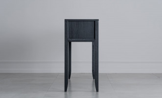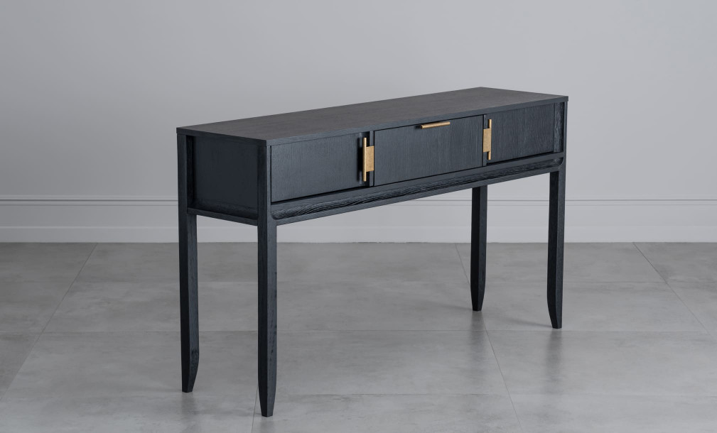 Консоль City с 1-м ящиком и 2-мя распашными фасадами заслуживает внимания обладателей взыскательного вкуса. Наполненная природной энергией древесина тёмного дуба завораживает своим рисунком, а контрастирующая с её оттенком латунная фурнитура подчёркивает уникальный характер изделия.