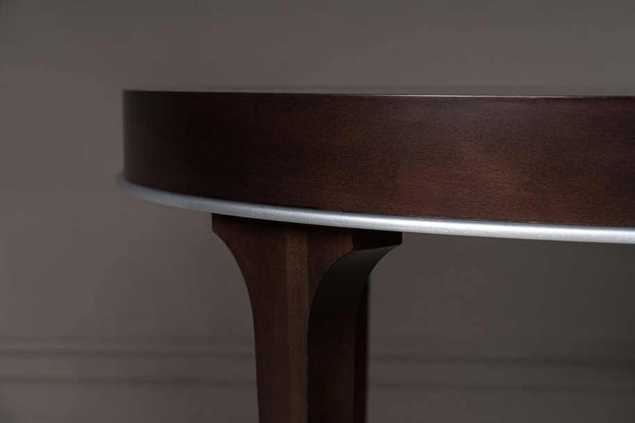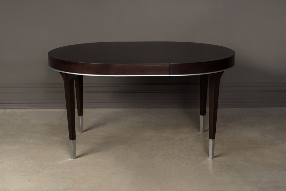 Обеденный стол Гранд выполнен в благородной стилистике всей коллекции: насыщенный цвет, металлические детали, зауженные книзу ножки и подчёркивающий овальную форму столешницы кант.