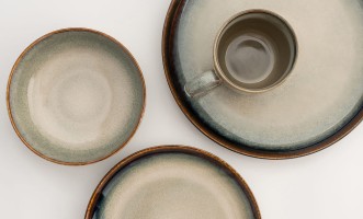 Посуда Moana напоминает о лесной просеке в туманной утренней дымке: значительная площадь внутренней поверхности тарелок, пиал и чашек выполнена в успокаивающем взгляд трендовом оттенке шалфея. Ближе к краям цвет через градиент переходит сначала к насыщенному хвойно-зелёному, а затем к коричневому, формирующему тонкую окантовку.