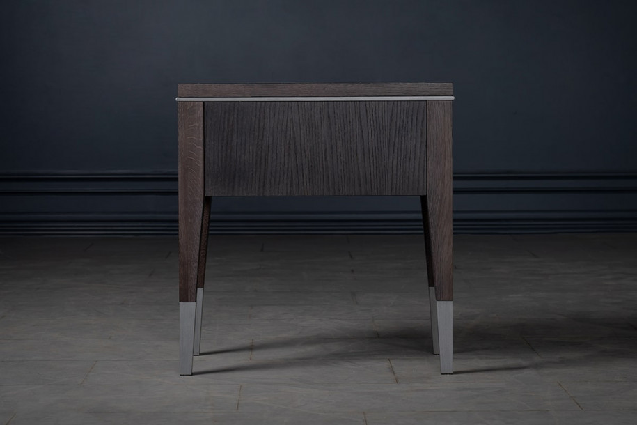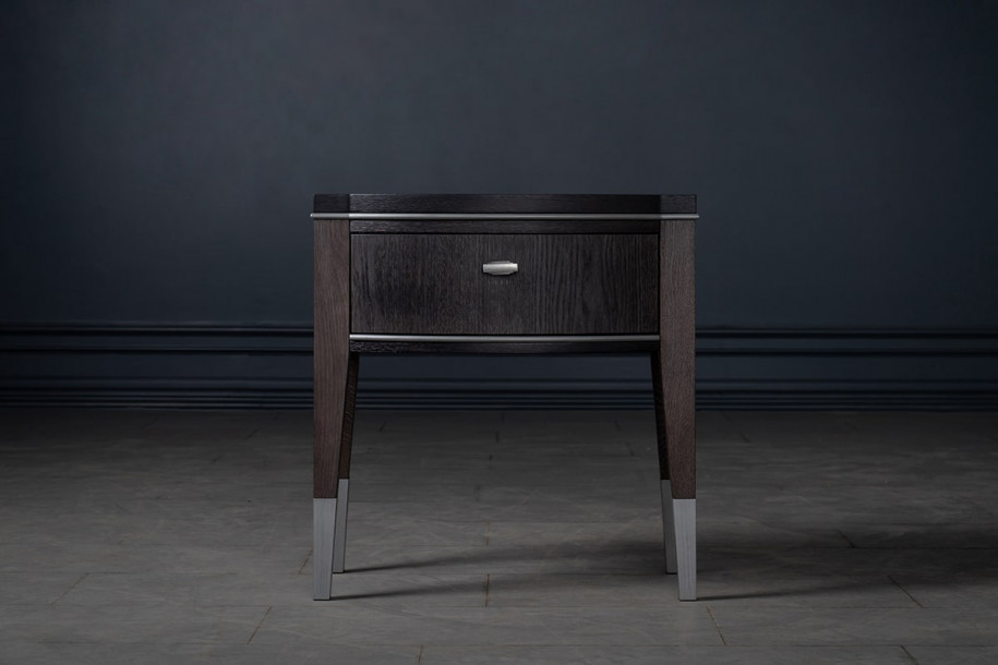 Прикроватная тумба Гранд с 1-м ящиком выполнена в стиле неоклассики. Она сочетает в себе традиционный силуэт и достаточно необычный выбор материалов. Тёмный дуб в сочетании с металлической фурнитурой, декоративной окантовкой и наконечниками ножек с эффектом матового хрома выглядит смело. На тумбе удобно разместить настольную лампу и книгу для чтения перед сном, скрыв личные вещи в выдвижном ящике.