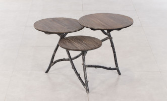 Столик Trio S с трёхуровневым дизайном и разной высотой столешниц излучает деревенский шарм и естественную элегантность. Тёмное дерево с уникальным рисунком текстуры стоит на ножках, напоминающих настоящие ветки, создавая гармонию органических текстур и мастерства. Идеально подходит для гостиных или уголков для чтения, добавляя визуального интереса, но не перегружая пространство.