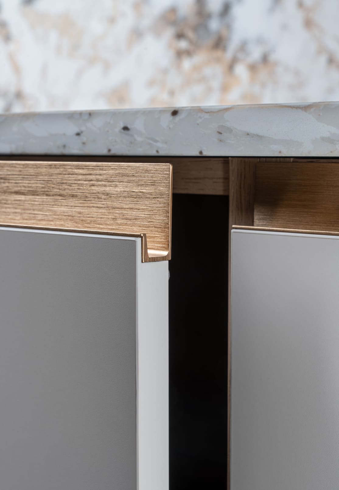 Ручки в стандартном представлении у этой коллекции отсутствуют – их заменяет удобная и быстрая в использовании система открывания, объединённая с фасадом